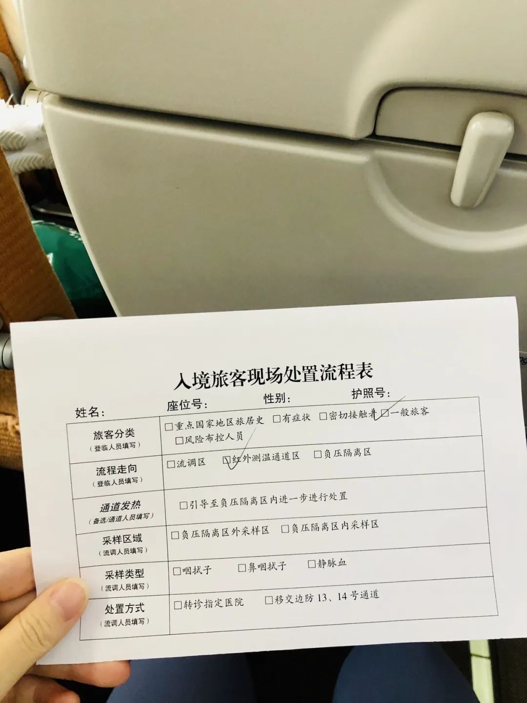 大哥一脸无助地说:“我就是个司机,我自己住的,没接触过。”之后,就被发放了一张《入境旅客现场处置流程表》,上面则被划了“风险布控人员”。工作人员说:“你待会先留下,等其他的人先走,你最后听我的指挥,再下机跟着我走”。