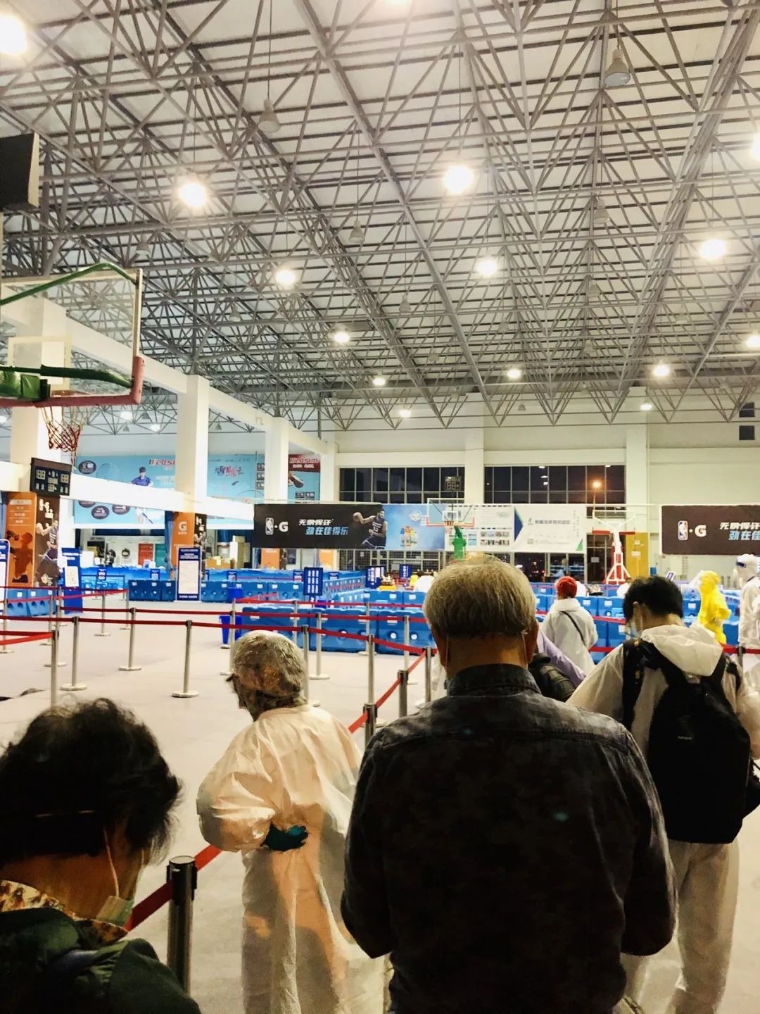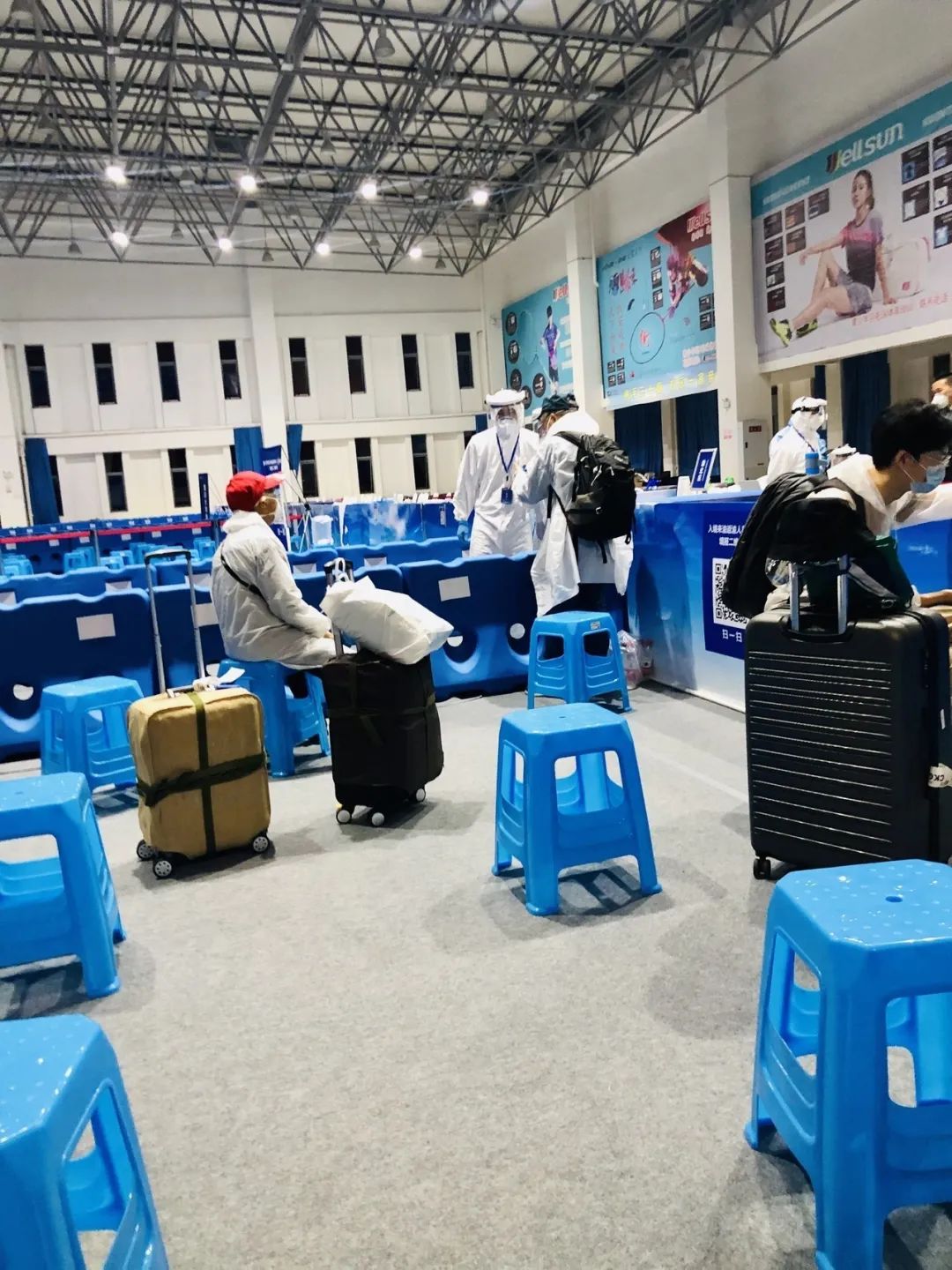 工作人员在点名确认所有乘客上车后,便关上车门。大巴由一辆开着双闪的车带路,前往重庆渝北体育馆。单独的车辆安排,应该也是为了尽量减少工作人员与乘客的接触频率。到了分流中心之后,我们被分流到不同的区域候车,登记。
