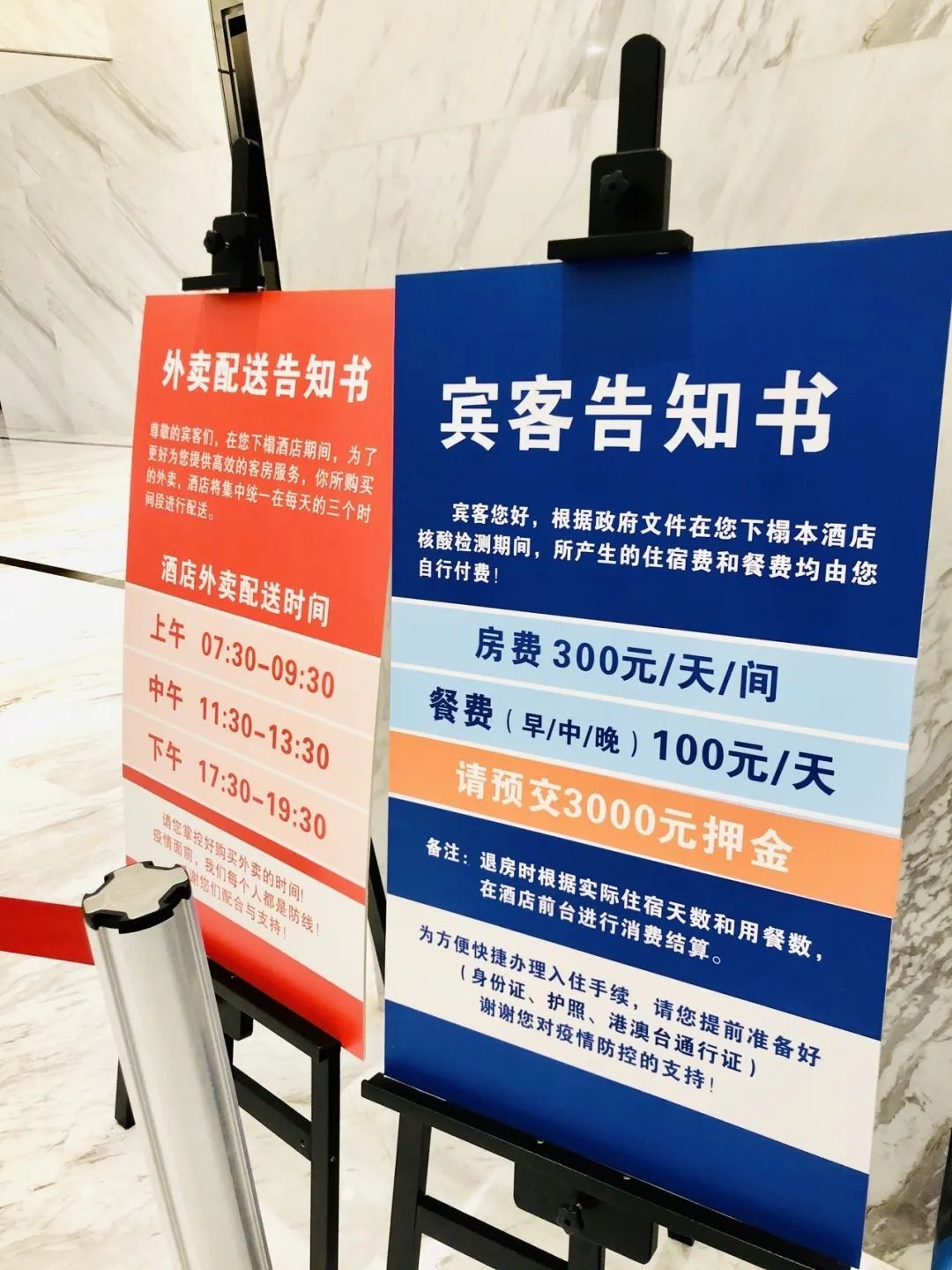 进入大堂后,看到大厅张贴了《宾客告知书》,根据国家规定,所有入境人员的隔离14天的住宿费和餐费是自费的,费用是¥400/一天包一日三餐,¥300一天则是不包含餐费的。