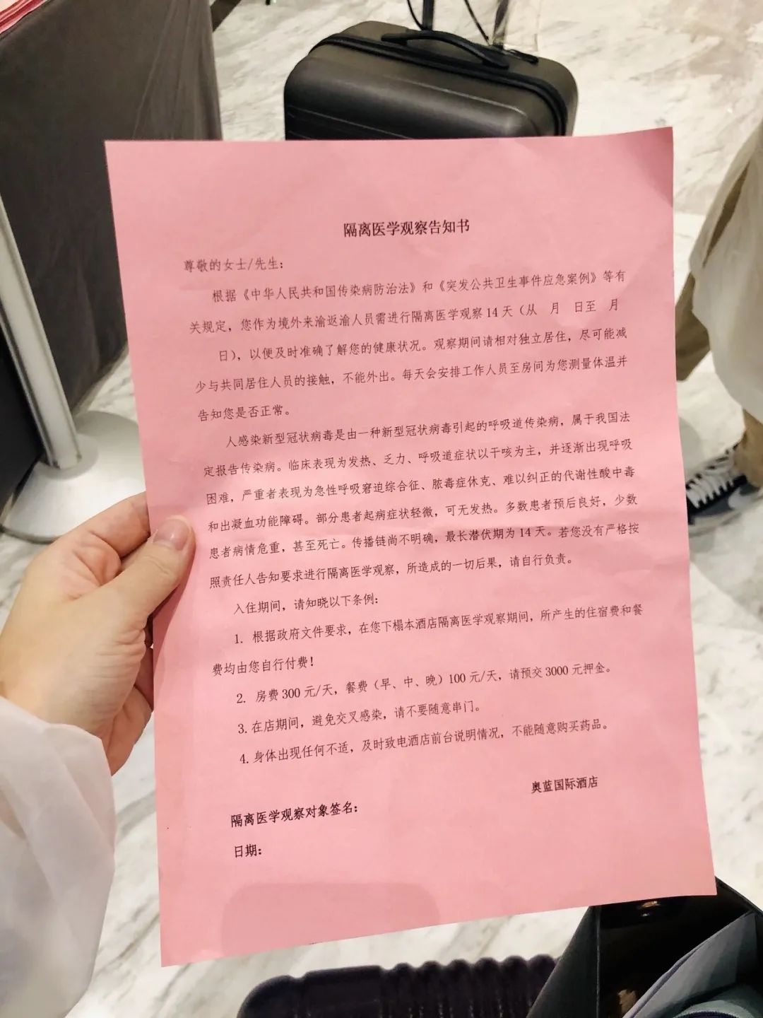 不到十分钟,我们就到达了位于空港东路55号的奥兰国际酒店。门口工作人员发放了《隔离医学观察告知书》,让大家一一签署确认。