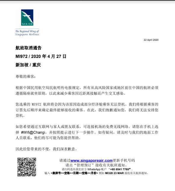 因此今天新加坡飞重庆的航班,有一部分买了票的乘客,到了机场却被告知:机位取消,无法登机。