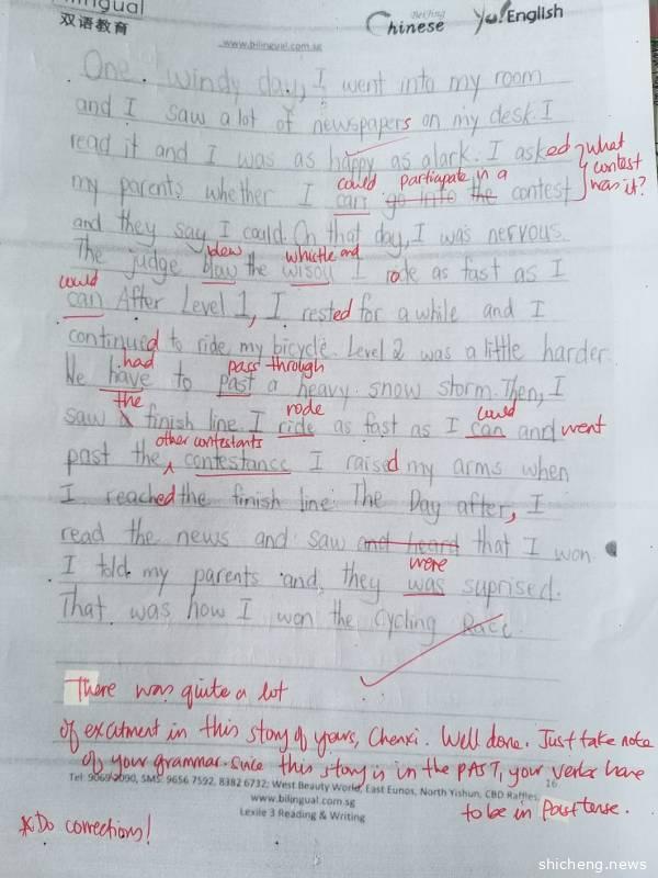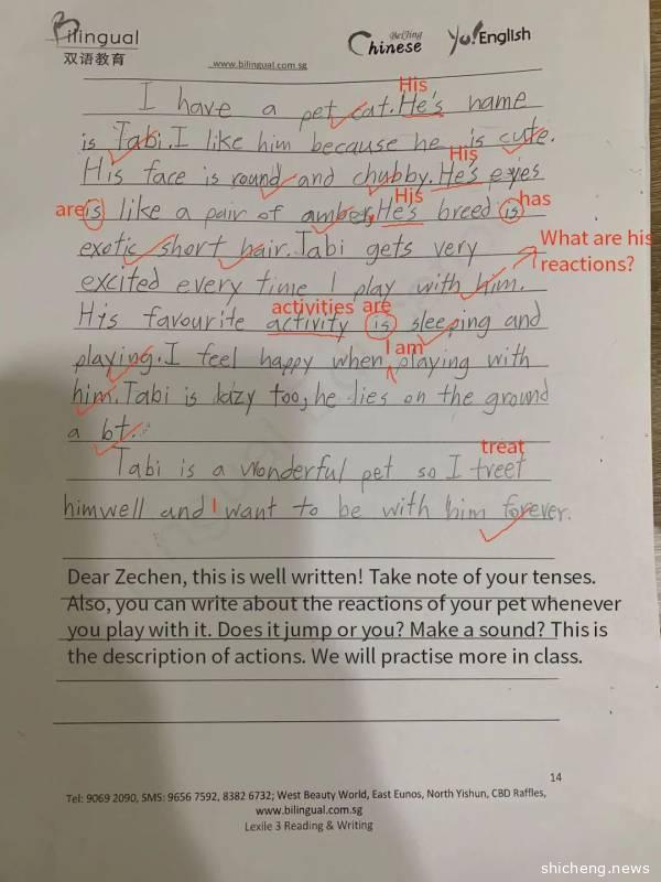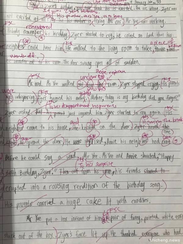 (这是另外一位老师Catherine批改的作文,P3的孩子正在学习如何描述一个行为和反应,这些方法在高年级的写作当中非常有用。)
