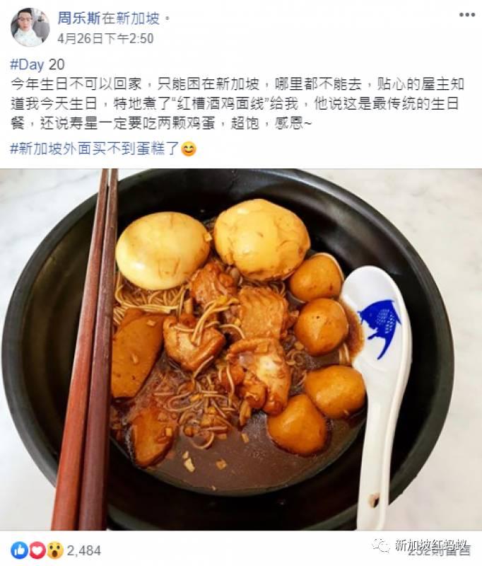 “今年生日不可以回家,只能困在新加坡,哪里都不能去,贴心的屋主知道我今天生日,特地煮了“红槽酒鸡面线”给我,他说这是最传统的生日餐,还说寿星一定要吃两颗鸡蛋,超饱,感恩。”