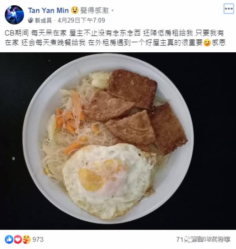 “阻断措施期间,每天待在家里,屋主不但没有念东念西,还降低了房租。只要我在家,每天都会煮晚餐给我,在外租房遇到一个好屋主真的很重要,感恩。”