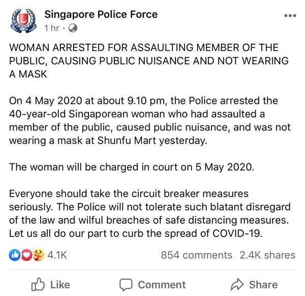 新加坡警方表示,警方周一将她逮捕,次日将会上庭。新加坡网民无不对此“喜大普奔”- 喜闻乐见、大快人心、普天同庆、奔走相告。