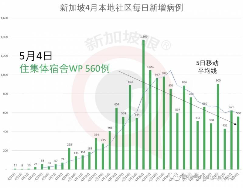 客工宿舍疫情4月20日达到高峰(当日1369人确诊)之后,开始回落,每日新增病例从4月21日至27日的日均871起,降到4月28日至5月4日的日均597起,降幅为32%.社区感染方面,昨天新增病例中,5人是公民/永久居民/长期准证持有者,8人是不住宿舍的WP。