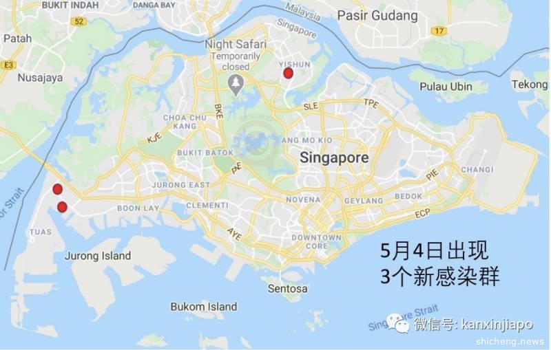 新加坡5月4日出现3个新感染群:1. 位于大士1道街(Tuas Avenue 1)9号的Hai Leck Engineering Pte Ltd:共13人2. 义顺44街(Yishun Street 44)477A号的Melody Springs建筑工地:5月4日确诊2人与之前的41人有关,形成本感染群,一共43人3. Tuas Basin Link 16号:5月4日确诊6人与之前5人有关,形成本感染群,一共11人