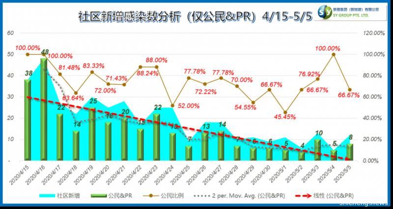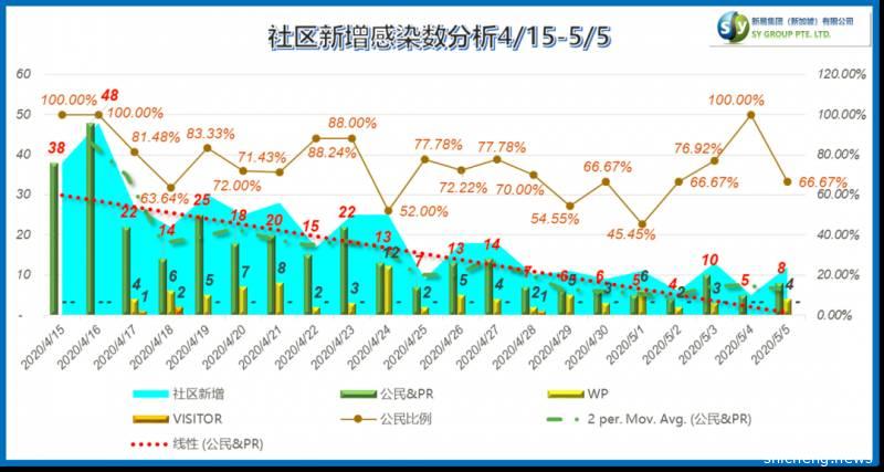 社区中的新增病例情况自4/16以来事实上一直都呈现下降趋势,尤其是公民&PR的新增情况,自4/25第一次出现个位数增长以来,11天中有8天均为个位数增长,很明显这是疫情在社区中得到有效遏制的结果。