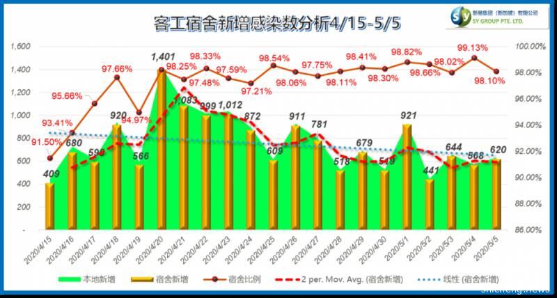 上述图表是自4/15开始的统计数据,可以看到,本地病例的增长势头正在逐步减缓,从日增长连续突破千例到目前的平均600多例,增长势头已经得到有效控制,而增长趋势线(绿色虚线)也终于呈现出平稳下行的趋势。下列图表则是迄今为止增长最为迅猛的客工宿舍病例增长趋势图,可以更为直观地显示出客工宿舍的情况也在得到逐步缓解。