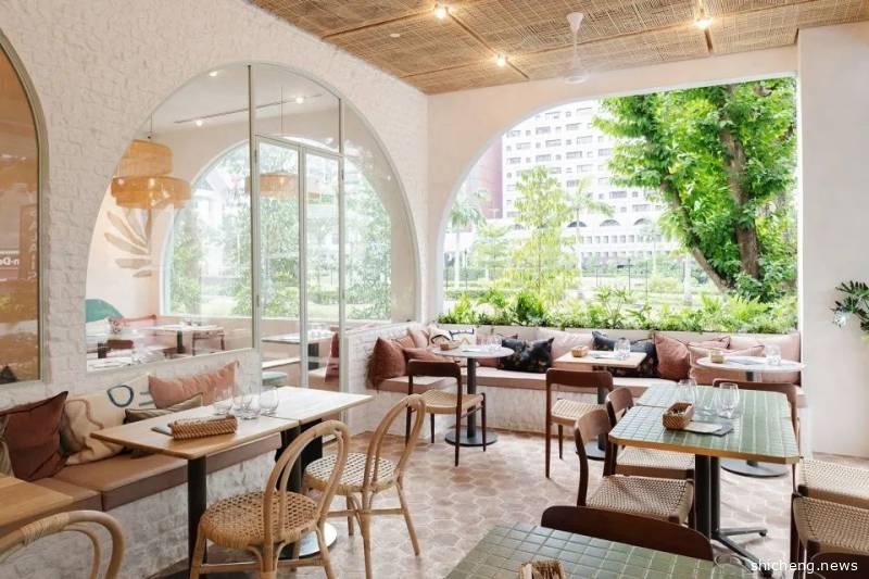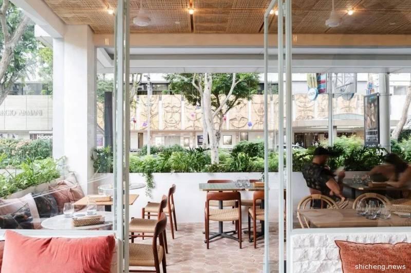 Merci Marcel Tiong Bahru的室内设计灵感源于法国的里维埃拉和巴厘岛的热带风情,店门前木质家具和图腾枕头强烈表达了热带风情感。同时,大玻璃窗也营造了十足的通透感,使空间看起来更大。