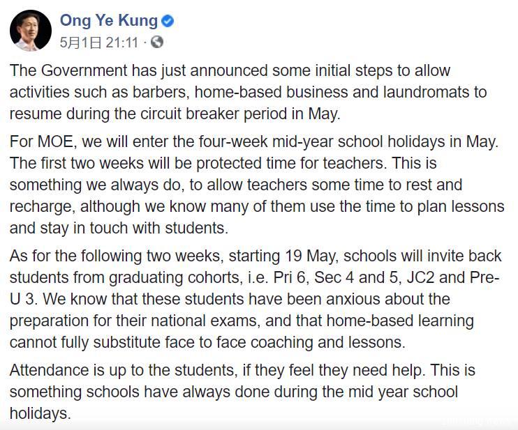 王乙康也通过社交网站Facebook发文表示,接下来两个星期将是教师休息和充电的时间。教育部理解毕业班学生会对应考感到焦虑,而居家学习无法完全取代同老师面对面的学习方式。因此让应届考生以小组的型式,在指定日子回到学校。校方会优先考虑需要学校设施做功课或进行实践课,以及需要额外辅助和补课的学生。