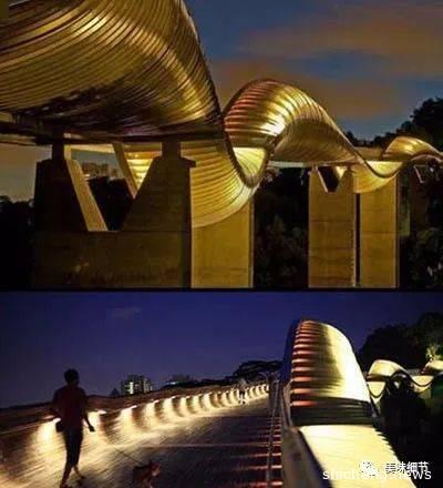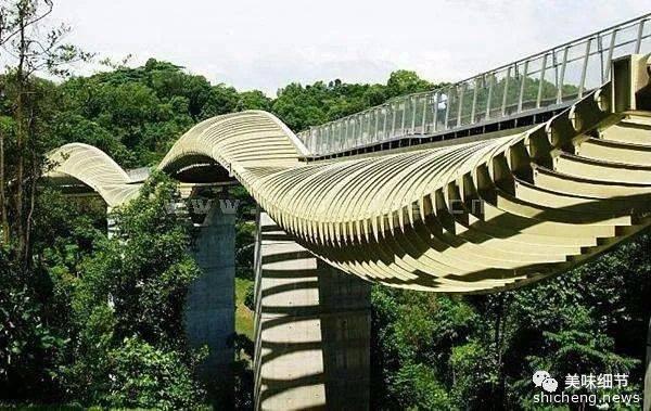 第三个地方是亨德森波浪桥,它是新加坡最高的人行天桥,造型别致,桥身犹如波浪,有四个波峰和三个波谷,给行人提供了观景的新高度,其波浪状的设计给人以视觉上的冲击力,动感十足。它衔接了花柏山公园和直落布兰雅山公园。全桥采用无障碍设置,桥面木质的,防滑,没有梯阶,设有扶手。站在桥上,有一种置身于森林之上的感觉,夜景远观非常漂亮,像波浪一样。我们曾晚上漫步桥上,桥面呈波浪状,此起彼伏,高于地面的木质平台上,一对对小夫妻带着孩子坐在上面休闲,有大人睡在上面纳凉,小孩在旁边嬉笑。也有人在此徒步锻炼。