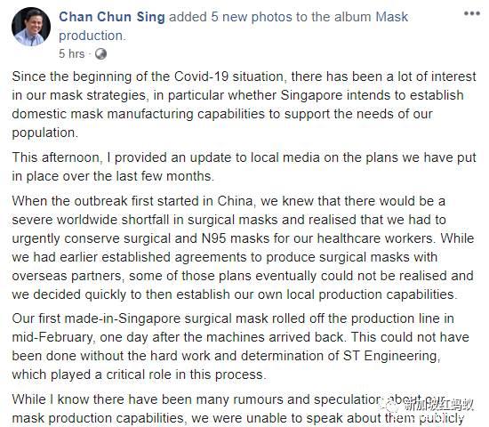 他也透露,第一个新加坡制造的手术口罩是在2月中旬诞生,也就是机器运回新加坡的第二天。如果没有新科工程的努力和决心,这是不可能办到的,新科工程在这过程中发挥了关键的作用。
