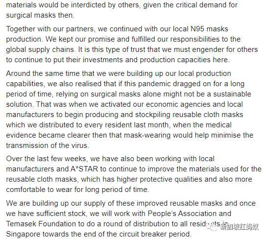 “在过去的几周里,我们也一直在与本地制造商和新加坡科技研究局(ASTAR)公司合作,继续改进可重复使用的布口罩的材料,使它的防护功能更高,以及更适合长时间佩戴。”
