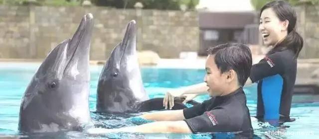 温顺的海豚推著小小的人儿在水面漂浮,或者和海豚来个亲密接触,给它一个大大的拥抱。