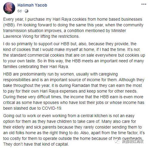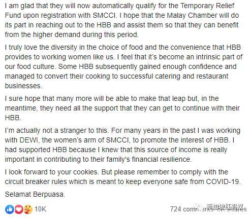 上星期五,哈莉玛总统在脸书上贴文,为居家烘焙糕点的马来妇女请命,希望她们不受“阻断措施”所限,还能一如既往在开斋节期间售卖糕点,赚点钱补贴家用。