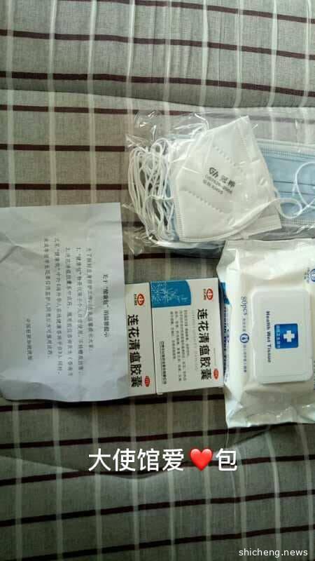 大使馆发布的图片显示,“健康包”包装箱上写着“同胞平安,祖国牵挂”的字样,而“健康包”内有口罩、消毒纸巾、中药等防疫物资及防疫手册。