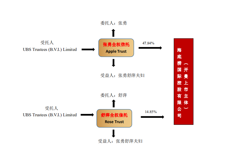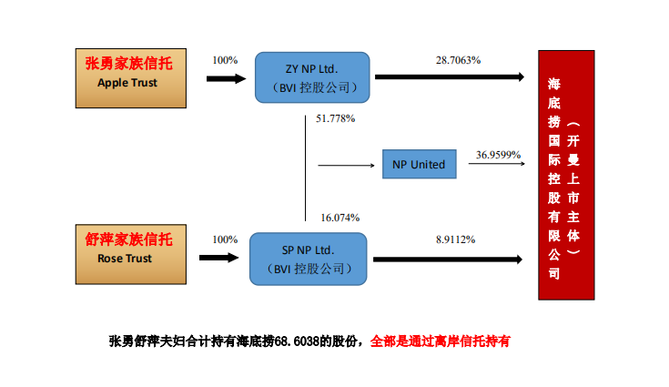 而离岸信托是在至上市前,张勇、舒萍夫妇所持海底捞公司的全部股份62.70%(全球发售前),全部是通过“离岸家族信托+BVI公司”持有的,按照目前的市值计算总价值超过1100亿。