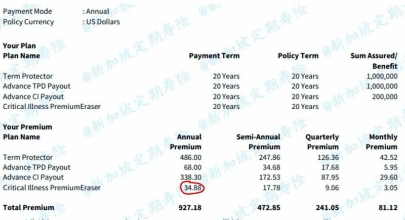 客户仅附加重疾保费豁免的保费仅34.88美金,却可以在罹患重疾之时让自己不用再担心余下保费的缴付。换句话说,如果购买重疾险,一定是要优先选择有重疾保费豁免的保险(重疾保费豁免也分包含轻症和不包含轻症,建议优先选择包含轻症的)。目前新加坡只有为数不多的两家保险公司有完全豁免未来保费的轻症重疾豁免条款,有一些是没有豁免条款或者仅豁免未来几年保费的,大家一定要谨慎挑选,问清楚所找的代理人。