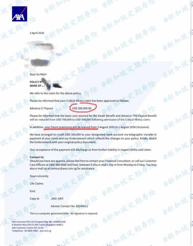 公司通知理赔通过,理赔额度20万美金,并且将从2020年起开始豁免客户未来所有保费(因附加了罹患重疾保费豁免条款)直到20年保障期结束。