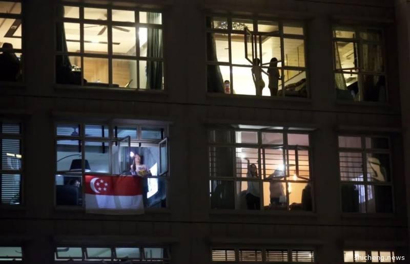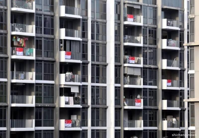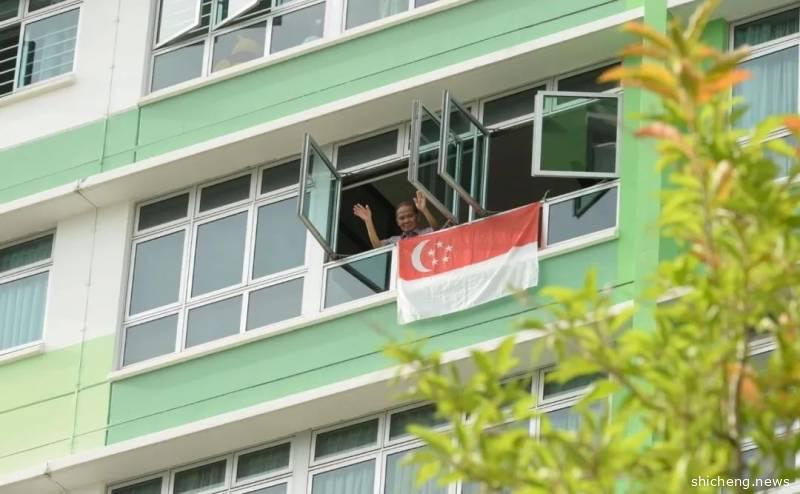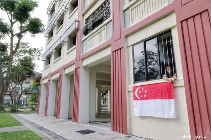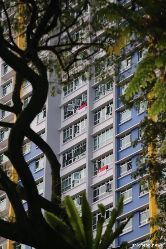 组屋内的多个住户往家外悬挂国旗,此社区是其中一个高唱《家》的社区。