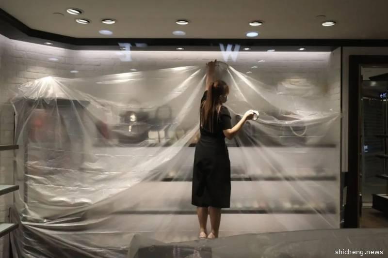 白浮沙广场(Bugis Junction)大部分店铺都会关闭,员工在关门前都会为展示架挂上防尘塑料布。