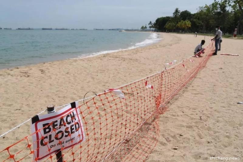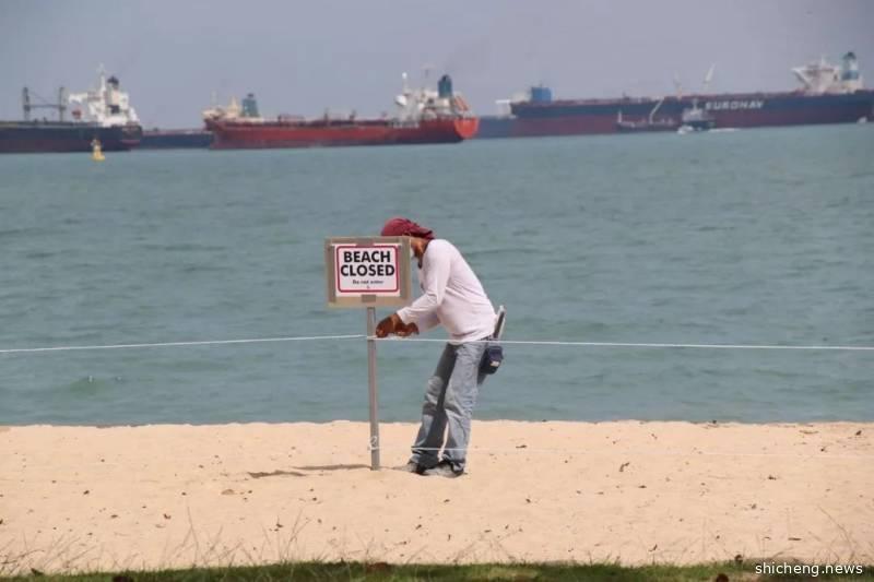 工作人员在东海岸公园插上“沙滩已经关闭”的告示牌,再用绳子将沙滩围起,不让游客进入。