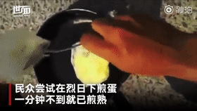 民众尝试在阳光下煎蛋,不到一分钟就熟了: