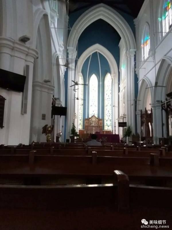 我们穿过拱形大门步入教堂,只觉得眼前豁然一亮,给人以高大、肃穆的感觉,足以使得进入他怀抱的每一个人,都感到自己的渺小。那占据了半圆形后殿的三面炫目多彩的彩绘玻璃窗,每一面彩窗纪念著新加坡历史上的重要人物,正中央的彩窗绘著的正是莱佛士爵士。