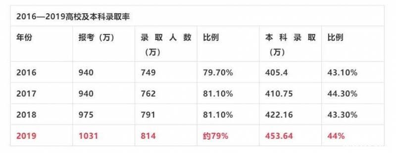 而中国2019年的考生高达1031万人,本科录取率仅44%