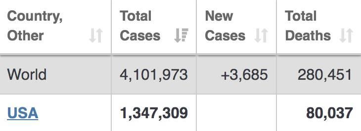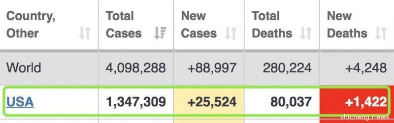 占全球总确诊病例人数的四分之一,累计死亡病例(80037人)已经和中国的总确诊病例(82901例)擦边。