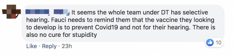 “福奇需要去提醒他们现在最要紧的事情是研发应对新冠病毒的疫苗,而不是让他们自娱自乐只听自己想听的话。真是愚蠢得没救了。”