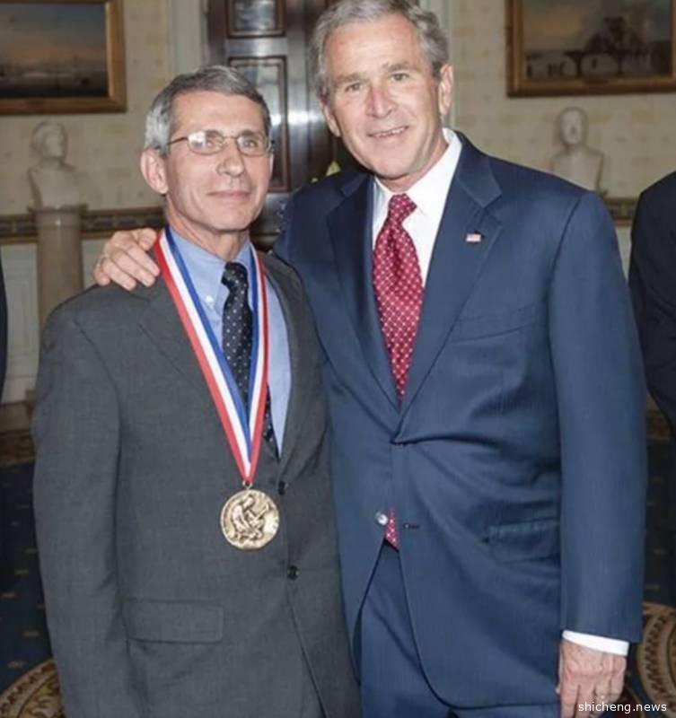 福奇和总统小布希合影,于2008年获得“总统自由勋章”