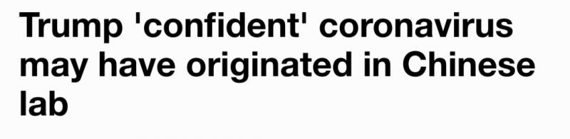 4月30日,美国总统特朗普在没有提供任何证据的情况下声称:有可信度极高的情报表明病毒来自武汉病毒研究所。