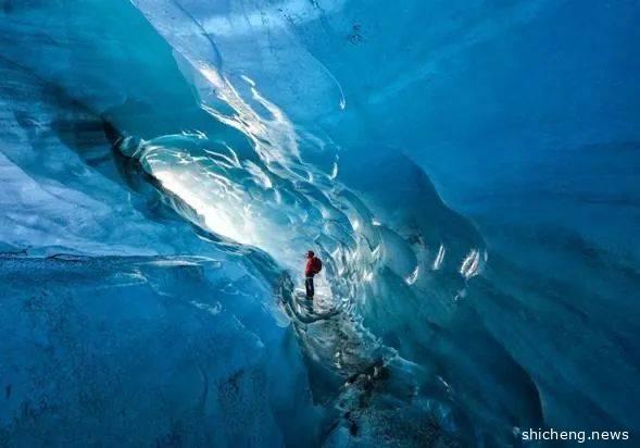 冰岛斯维纳冰川(Svinafellsjokull)的一个冰洞。由于气温连年上升,冰的融化量逐年上升,导致冰洞越来越大,过去15年覆蓋冰洞的冰层消失了12%。