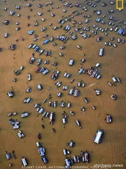 鸟瞰柬埔寨被洞里萨湖(Tonlesaplake)包围的水上浮村(Chong Kneas)。因为气温升高导致降雨模式改变,洞里萨湖原有的生态面临着严重威胁。