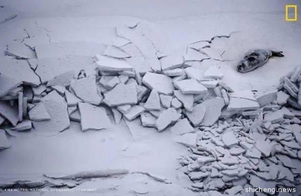 在南极罗斯岛(Ross Island)附近,浑身滚满雪的海豹散发着伤感的情绪,它身边的冰层由于气温上升正在大量地断裂。