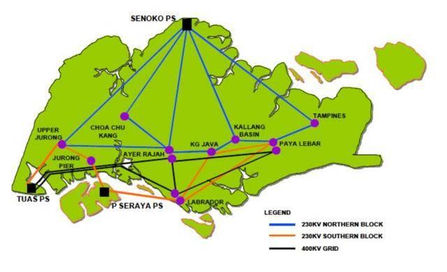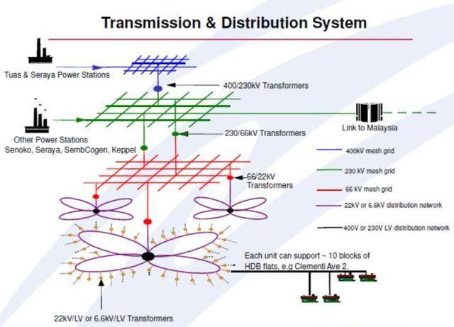 上图中,新加坡tuas电厂(目前属于中国华能集团)+seraya电厂并入400kV电网,其余电厂并入220kV电网,66kV是输电网范畴的最低电压等级并以此为过渡,电压等级再往下走就是传说中的22kV/6.6kV花瓣式配网。