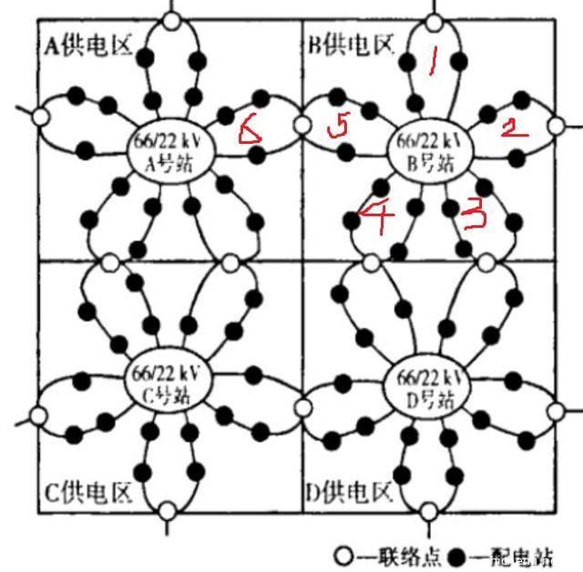 如图所示的A、B、C、D四个配电区域中,实心黑点代表普通配电站,空心白点代表联络配电站,以B区为例: