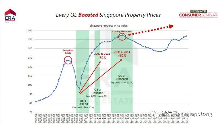 每次量化宽松政策都带动新加坡房地产上涨:QE1,QE2后新加坡房价上涨52%,QE3后上涨62%。