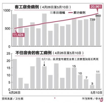 截至昨天中午,住在宿舍的32万3000名客工中,已有20961人染病,感染率达6.49%。