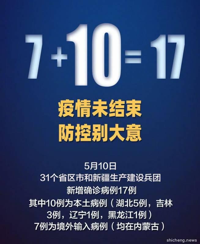 5月10日0-24时,31个省(自治区、直辖市)和新疆生产建设兵团报告新增确诊病例17例,其中10例为本土病例(湖北5例,吉林3例,辽宁1例,黑龙江1例),7例境外输入病例(均在内蒙古);无新增死亡病例;无新增疑似病例。