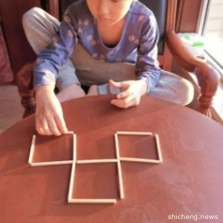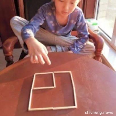 我问儿子第1个问题:你能拿出两个木棒其余木棒不动使它变成大小不同的两个正方形吗?