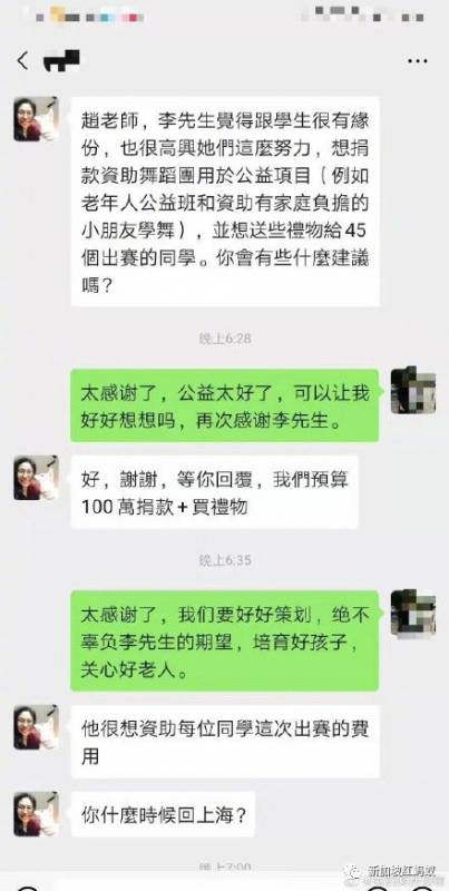 这名老师在微博开心地公开了一条微信对话。原来李嘉诚先生偶遇了这群孩子之后,便吩咐自己的秘书联系带队老师,要从“李嘉诚慈善基金”捐出100万元人民币(约19万新元)用于公益项目,例如供老人参加舞蹈公益班,或是资助有家庭负担的小朋友学舞。