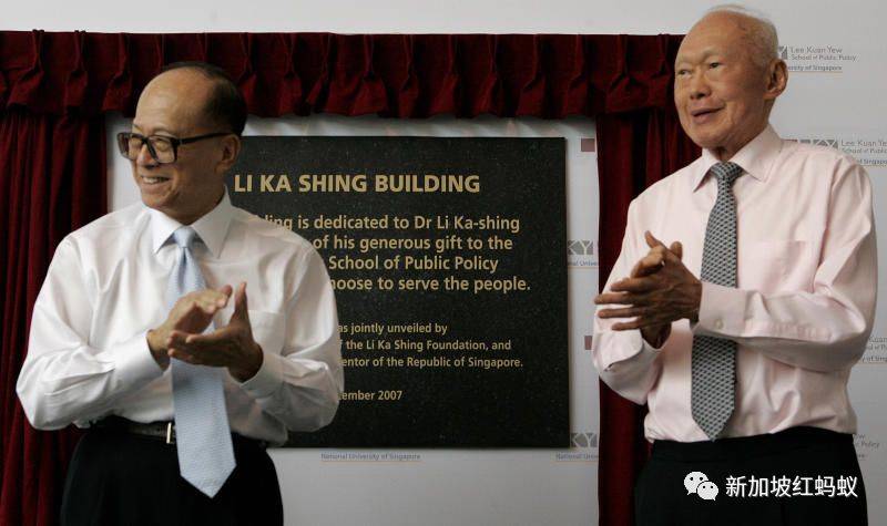 李嘉诚大楼在2007年举行开幕典礼,李嘉诚和时任内阁资政李光耀 (右)亲临现场。(海峡时报)