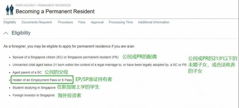 Holder of an Employment Pass or S Pass(EP/SP准证持有者):EP 准证(Employment Pass)和 SP 准证(Skilled staff Pass)是目前新加坡可申请永久居民身份的两种工作签证,也是目前绝大多数人会选择的移民方式。