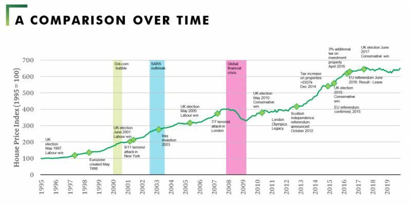 根据最近30年的数据,英国的房价稳步上涨,增长曲线相对平稳。
