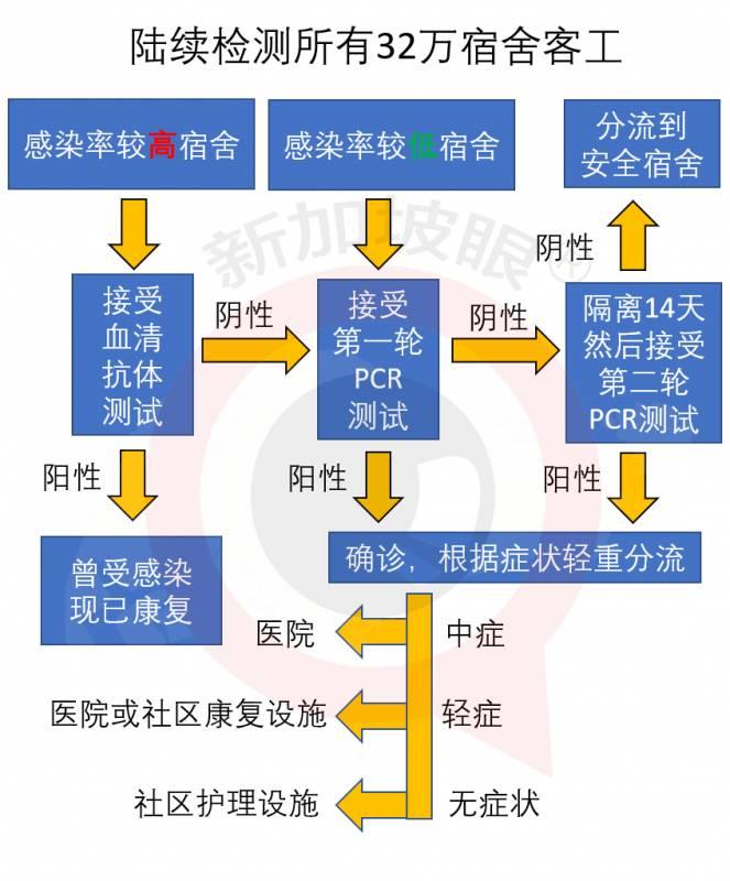 新加坡政府说,将陆续对所有32万住在大型集体宿舍的客工做病毒检测。目前已经完成3.2万人的检测,其他预计在几周内陆续完成。