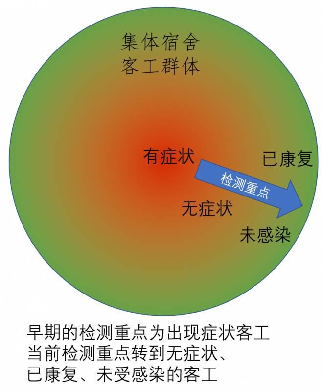 4月初,客工宿舍爆发疫情之后,为了尽快筛分有无受感染,检测工作重点在已经出现症状的客工。到了本阶段,检测工作重点转为未出现症状客工。这部分人占整个群体的绝大多数,其中可能有受感染的无症状带病毒者,有已经自行康复的,也有未受感染的,必须一一检测筛分。