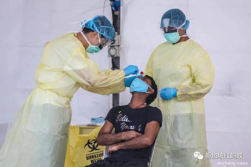 客工们在宿舍内接受拭子检测。(海峡时报)